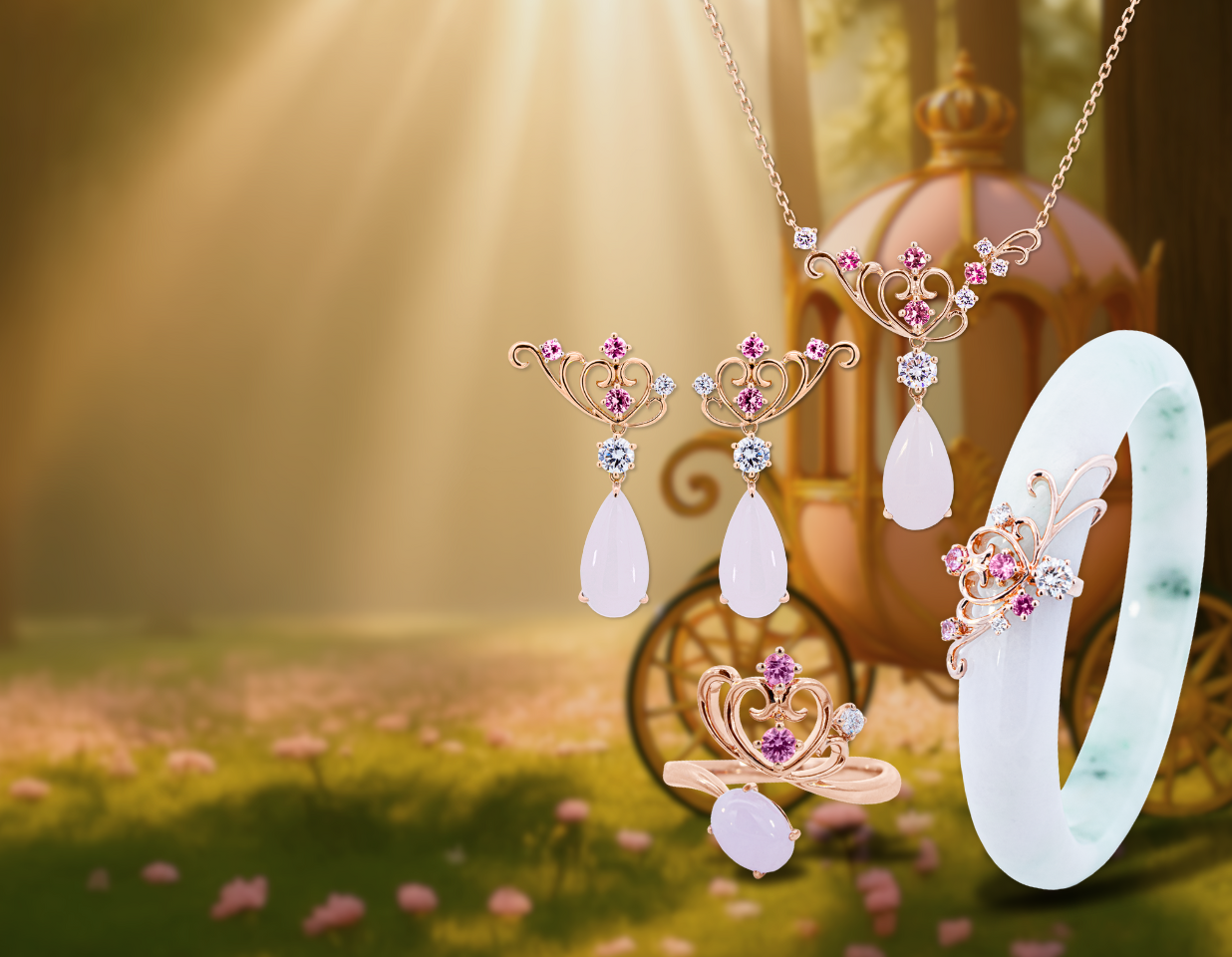 Inspired by the timeless elegance of Cinderella’s carriage, the Evora Collection is a romantic tribute to brides who dream of a magical beginning and a love that lasts forever. Designed with subtle fairytale symbolism, each piece features delicate curves, enchanting pink sapphires, and brilliant lab-grown diamonds — capturing the soft glow of true love. More than just wedding jewelry, Evora is crafted to be cherished and passed down, telling a love story that lives on through generations.