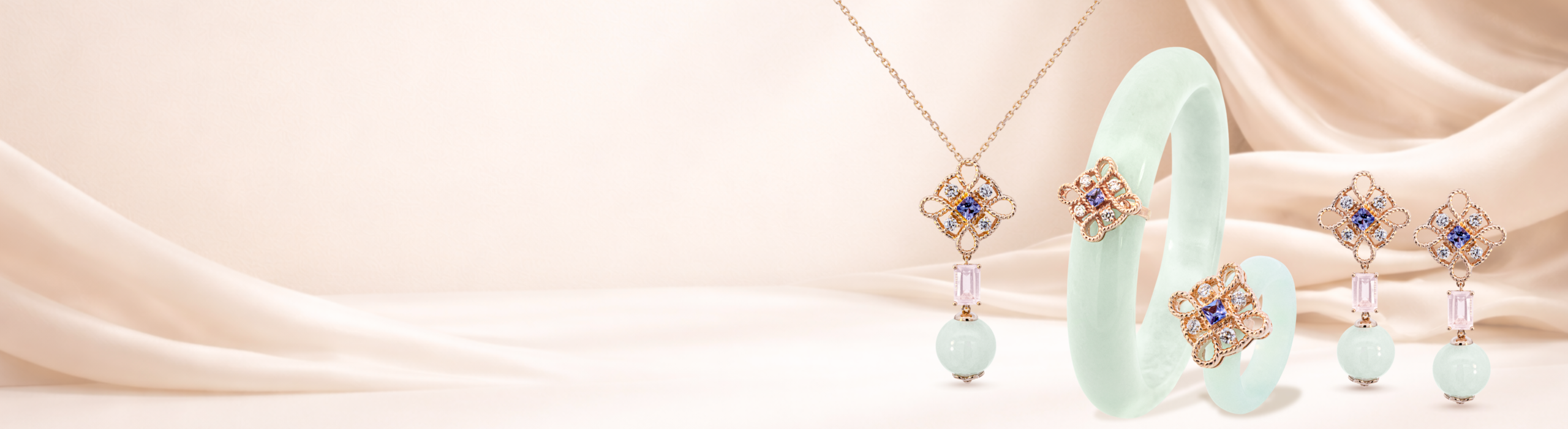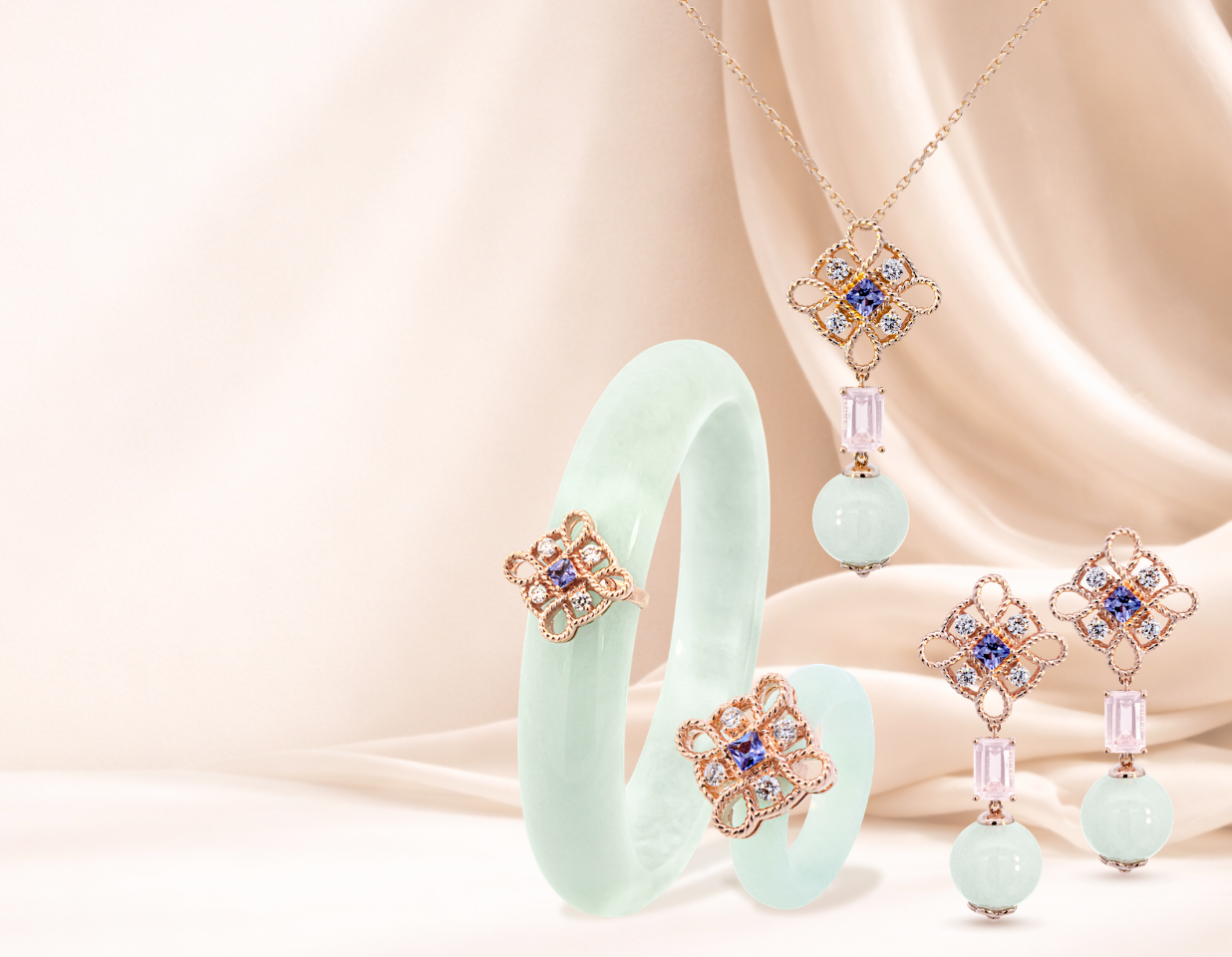Drawing inspiration from the intricate patterns of Peranakan tilework, our Zena Collection reflects a graceful union of heritage and contemporary elegance. Each piece features a diamond shaped centrepiece with an open geometric silhouette and finely detailed framework, adorned with brilliant lab grown diamonds and a rich tanzanite gemstone. Accents of soft rose quartz and a luminous jade bead complete the design, infusing the collection with refined exotic charm and a celebration of culture, craftsmanship, and modern femininity.